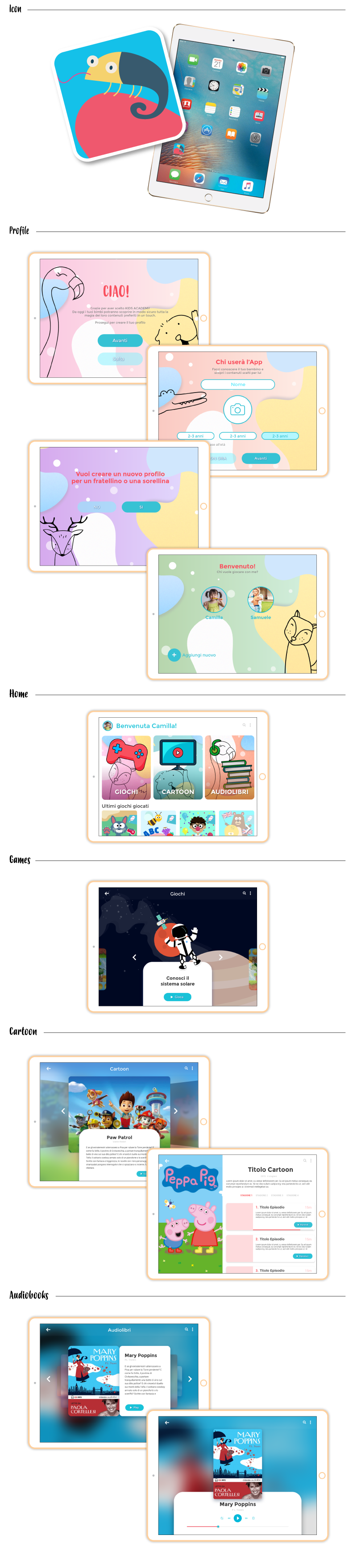 KIDS ACADEMY, un ambiente sicuro per i più piccoli, ed un nuovo modo di intendere le app per bambini: in uno scenario come quello attuale, in cui l’intrattenimento è diviso su piattaforme, portali e applicazioni diverse. Kids Academy porta divertimento, istruzione ed emozioni in un’unica app. L’Homepage è pensata a misura di bambino, la parte iniziale è suddivisa in 3 sezioni: Giochi, Cartoon e Audiolibri.